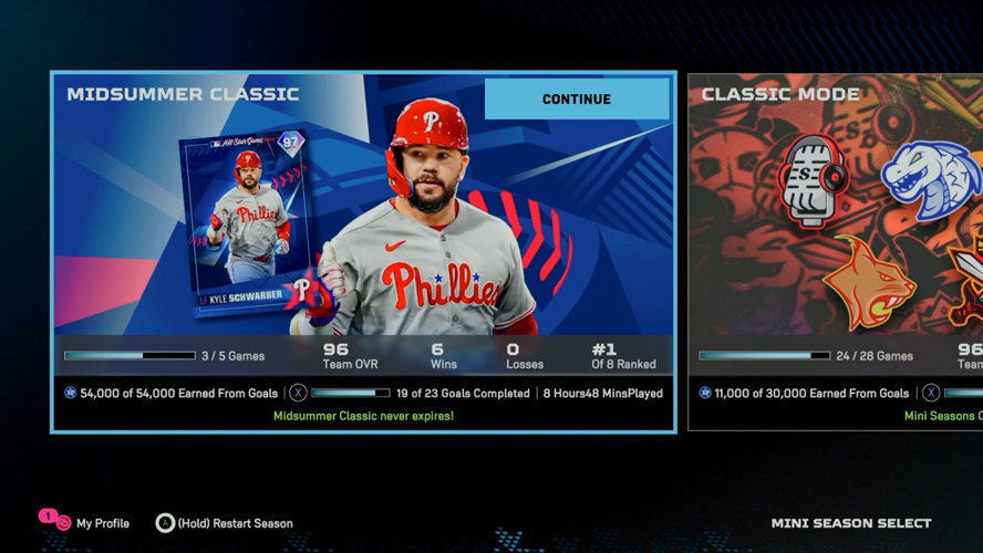 Mini seasons are a core offline feature where players take a team through a 28-game season of short, three-inning games, followed by best-of-five playoff series. While technically optional, participating in mini seasons becomes necessary if you want specific rewards, such as the Summer Series collection or All-Star cards. These exclusive items can only be earned by completing mini seasons, making them a gatekeeper for top content.
