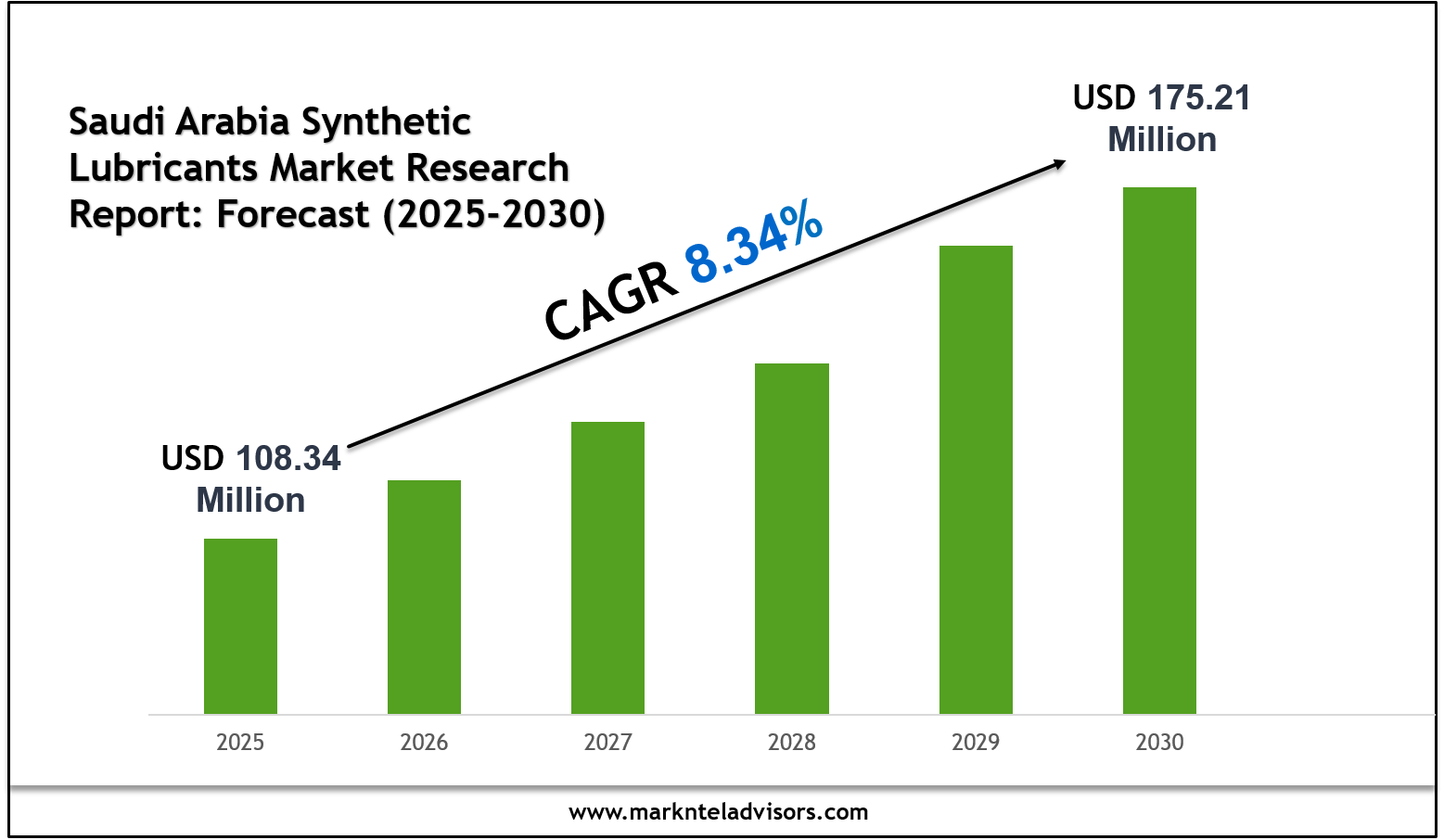 The Saudi Arabia Synthetic Lubricants Market size is valued at around USD 108.34 million in 2025 and is projected to reach USD 175.21 million by 2030. Along with this, the market is estimated to grow at a CAGR of around 8.34% during the forecast period, i.e., 2025-30.