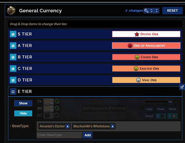 Item tiers, including currencies and base types, are organized according to their approximate worth, helping players prioritize valuable loot.